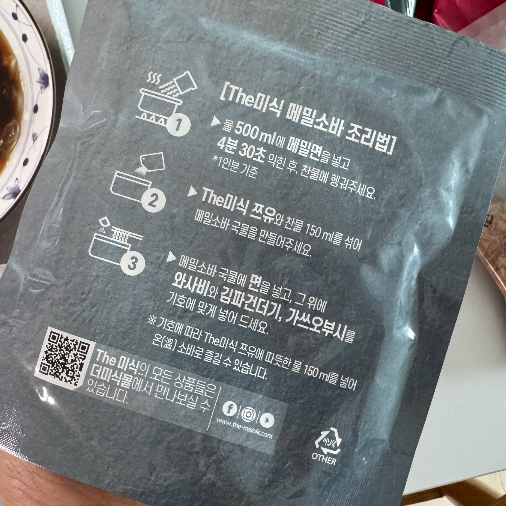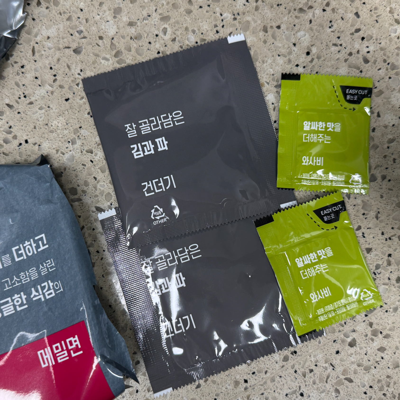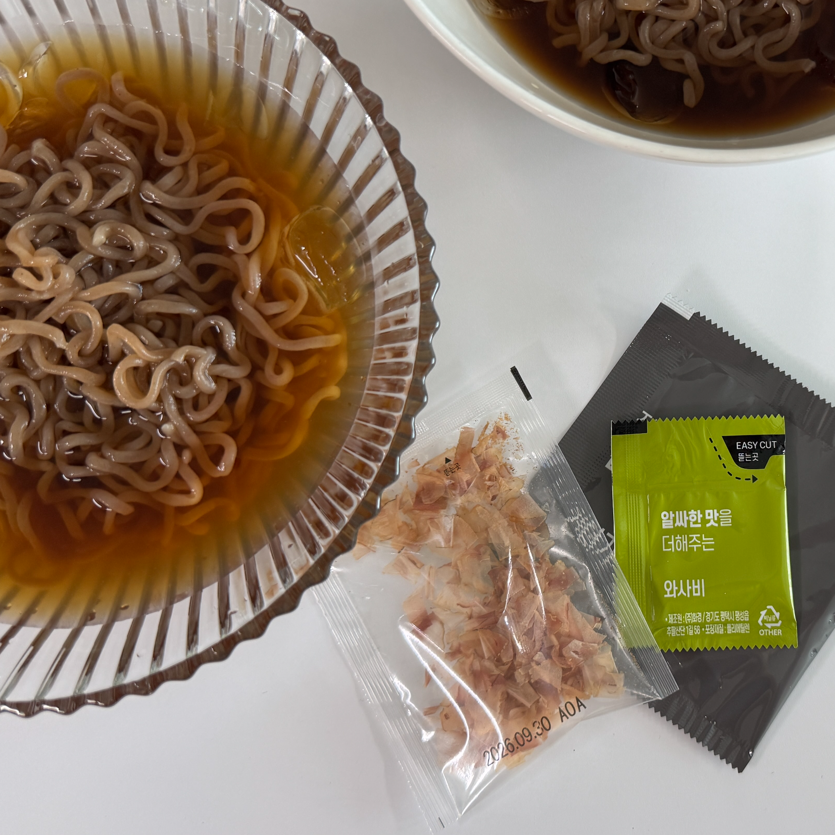 메밀면 봉지 안에 김파 건더기 스프와 와사비 봉지가